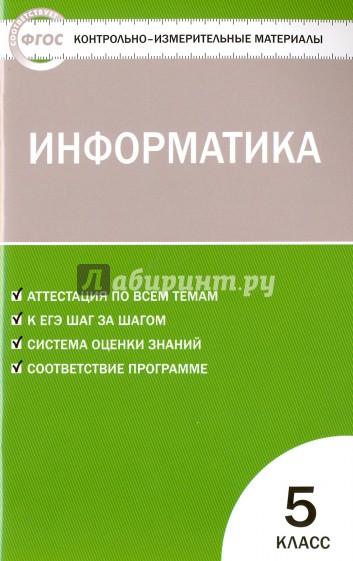 В пособии представлены контрольно-измерительные материалы (КИМы) по информатике для 5 класса. Издание составлено в соответствии с требованиями ФГОС. Структура КИМов аналогична структуре заданий ЕГЭ, что позволит постепенно подготовить учащихся к работе с подобным материалом. В конце издания предложены ответы к тестам.