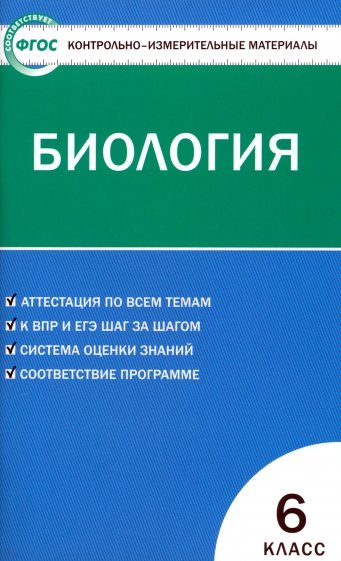 В пособии представлены контрольно-измерительные материалы (КИМы) по биологии для 6 класса. Издание составлено в соответствии с требованиями ФГОС. Структура КИМов аналогична структуре заданий ЕГЭ, что позволит постепенно подготовить учашихся к работе с подобным материалом. В конце издания предложены ответы к тестам.