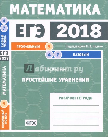 Рабочая тетрадь по математике серии "ЕГЭ 2018. Математика" ориентирована на подготовку учащихся старшей школы к успешной сдаче единого государственного экзамена по математике в 2018 году по базовому и профильному уровням. В рабочей тетради представлены задачи по одной позиции контрольных измерительных материалов ЕГЭ-2018.На различных этапах обучения пособие поможет обеспечить уровневый подход к организации повторения, осуществить контроль и самоконтроль знаний по теме "Простейшие уравнения". Рабочая тетрадь ориентирована на один учебный год, однако при необходимости позволит в кратчайшие сроки восполнить пробелы в знаниях выпускника.