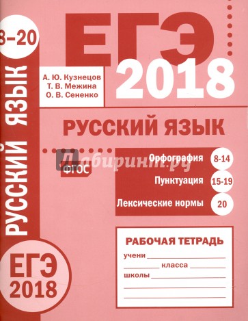 Рабочая тетрадь по русскому языку серии "ЕГЭ 2018. Русский язык" ориентирована на подготовку учащихся старшей школы к успешной сдаче Единого государственного экзамена по русскому языку в 2018 году. Пособие включает тренинги, соответствующие экзаменационным заданиям 8-14 (орфография) и заданиям 15-19 (пунктуация) и заданию 20 (лексические нормы).Авторы книги являются разработчиками контрольных измерительных материалов по русскому языку для основной и средней школы.