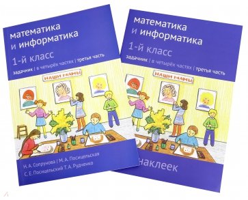 В комплект для третьего класса входят учебник в четырех частях и задачник в четырех частях и листы наклеек в четырёх частях.