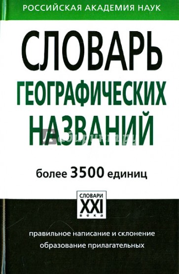 Словарь географических названий - результат многолетних исследований известного учёного, доктора филологических наук А. В. Суперанской. Он содержит сведения о склонении, написании и произношении свыше 3500 наиболее употребительных географических названий и соотносимых с ними имён прилагательных.
