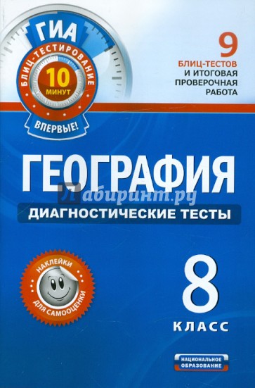 Пособие содержит материалы для проведения оперативной диагностики уровня освоения учебного материала в виде тематических тестов по наиболее важным блокам всех тем курса географии 8 класса, форма заданий которых соответствует форме заданий экзаменационной работы государственной итоговой аттестации (ГИА). Каждый тест представлен в двух вариантах. На выполнение одного варианта отводится не более 10 минут. В конце пособия помещён итоговый тест, состоящий из заданий всех тем курса.