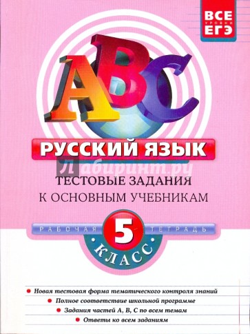 Рабочая тетрадь предназначена для тематического контроля знаний учащихся в новой тестовой форме (задания трех уровней сложности - части А, В, С) на уроках русского языка, а также для самостоятельного контроля знаний и систематической тренировки.