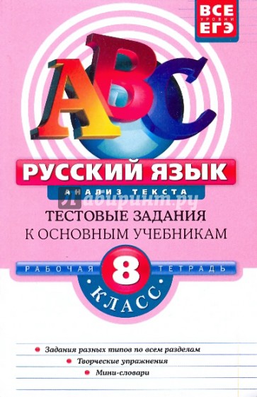 Данное издание представляет собой рабочую тетрадь по анализу текста, содержание которой соответствует школьной программе по русскому языку для 8-го класса. В пособие включены задания по всем разделам науки о языке, а также творческие упражнения, способствующие развитию речи. Рабочая тетрадь поможет учащимся усвоить структуру простых предложений разных типов, овладеть навыками осознанной расстановки знаков препинания в осложненных синтаксических конструкциях. В приложении приводятся мини-словари (толковый, синонимов, антонимов, устойчивых выражений), составленные по материалам упражнений.