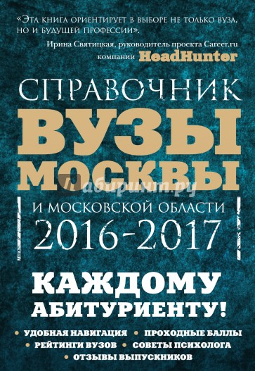 Книга, которую вы держите в руках, предназначена для выпускников школ, а также их заботливых родителей. Это незаменимый навигатор на таком важном этапе жизни человека, как выбор вуза - а, значит, и будущей профессии, специальности, призвания. Четко и удобно структурированный справочник содержит наиболее полную информацию о вузах Москвы и Московской области: о формах обучения, факультетах и специализациях, подготовительных курсах и вступительных экзаменах, проходных баллах и тех олимпиадах, результаты которых увеличивают шансы поступающих на успех. Здесь вы узнаете не только о количестве бюджетных мест на факультетах ведущих вузов и о конкурсах прошедшего года, но и о том, где созданы наилучшие условия для научных занятий, где предлагают стажировки, где самое современное техническое оснащение аудиторий. А также то, какие учебные заведения славятся отличными общежитиями, столовыми, командами КВН, клубами по интересам. В приложениях вы найдете необходимые сведения о порядке и характере ЕГЭ, примерные программы вступительных испытаний, календарь вузовских олимпиад, рейтинги "топовой" двадцатки высших учебных заведений. Отзывы выпускников передадут атмосферу реальной студенческой жизни. Выбирайте для себя оптимальный вариант, рассчитывайте свои силы! Данный справочник поможет вам не только сориентироваться, но и правильно подготовиться к будущему. Издание снабжено психологическими тестами, помогающим юным определиться с выбором, и советами психолога, как готовиться к экзаменам и вести себя во время них.