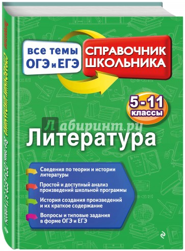 Справочник содержит сведения по всем темам, проверяемым на ОГЭ и ЕГЭ по литературе. Каждый раздел посвящен конкретному литературному произведению, удобно структурирован и содержит все необходимые сведения для успешного анализа: биографию авторов, историю создания и краткое содержание, жанровые особенности, перечень персонажей с характеристиками и много других полезных материалов. Кроме того, приводятся вопросы и типовые задания ОГЭ и ЕГЭ с ответами, информация по теории и истории литературы.