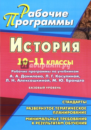 В пособии представлены рабочие программы по истории для 10-11 классов (базовый уровень), разработанные на основе авторской программы А. А. Данилова, Л. Г. Косулиной. Каждая программа содержит учебно-тематический план, требования к уровню подготовки учащихся, характеристику учебно-методического обеспечения, а также развернутое тематическое планирование системы уроков и педагогических средств.