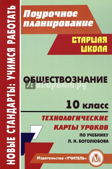 В пособии представлены технологические карты уроков, составленные по учебнику под редакцией Л. Н. Боголюбова "Обществознание. 10 класс" (М.: Просвещение, 2012). Предложенные разработки помогут учителю выстроить собственное видение урока на основе использования проблемных, поисковых и практических методов, отразить тот или иной инновационный педагогический подход в преподавании обществознания, определить объем освоения учебного материала и уровень владения компетенциями, развить универсальные учебные действия, необходимые для формирования гражданско-правовой позиции обучающихся.