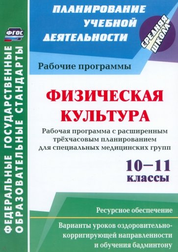 Одной из важнейших и актуальных проблем современной школы является решение задач по вовлечению в систему физического воспитания учащихся, отнесенных по состоянию здоровья к специальным медицинским группам и нуждающихся в особой регуляции интенсивности их физической нагрузки, проведению профилактических и обучающих мероприятий. В пособии представлена рабочая программа по физической культуре в 10-11 классах с расширенным трехчасовым календарно-тематическим планированием для специальных медицинских групп, составленная в соответствии с ФГОС среднего (полного) общего образования, с вариативным использованием уроков оздоровительно-корригирующей направленности и обучения бадминтону и их ресурсным обеспечением (традиционные и нетрадиционные формы спортивно-физкультурной работы: игры, комплексы ОРУ и рационального дыхания, гимнастика для глаз, стретчинг, тренинги, тесты, хатха-йога, самомассаж).