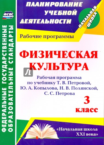 В пособии представлена рабочая программа по физической культуре для 3 класса, разработанная в соответствии с основными положениями федерального государственного образовательного стандарта, планируемыми результатами начального общего образования и требованиями Примерной образовательной программы, ориентированная на работу по учебнику Т. В. Петровой, Ю. А. Копылова, Н. В. Полянской, С. С. Петрова (М.: Вентана-Граф, 2014), входящему в УМК "Начальная школа XXI века".