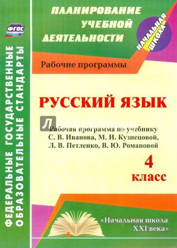 В пособии представлена рабочая программа по русскому языку для 4 класса, разработанная в соответствии с основными положениями федерального государственного образовательного стандарта, Концепцией духовно-нравственного развития и воспитания личности гражданина России, планируемыми результатами начального общего образования и требованиями Примерной образовательной программы, ориентированная для работы с учебником "Русский язык" С. В. Иванова, М. И. Кузнецовой, Л. В. Петленко, В. Ю. Романовой (М.: Вентана-Граф, 2014), входящим в УМК "Начальная школа XXI века".