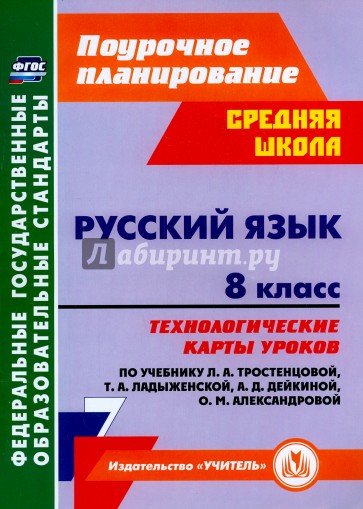 В пособии представлены технологические карты уроков по русскому языку для 8 класса, ' разработанные в соответствии с положениями ФГОС, ориентированные на работу по учебнику Л. А. Тростенцовой, Т. А. Ладыженской, А. Д. Дейкиной, О. М. Александровой (М.: Просвещение, 2015).