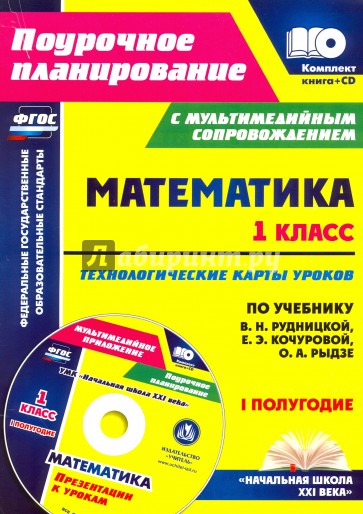 Предлагается комплект (книга + диск), состоящий из пособия с технологическими картами уроков математики в 1 классе (первое полугодие) и мультимедийного приложения с презентациями, разработанный в соответствии с положениями ФГОС НОО, ориентированный на работу по учебнику В. Н. Рудницкой, Е. Э. Кочуровой, О. А. Рыдзе (М.: Вентана-Граф, 2015), входящему в УМК "Начальная школа XXI века".