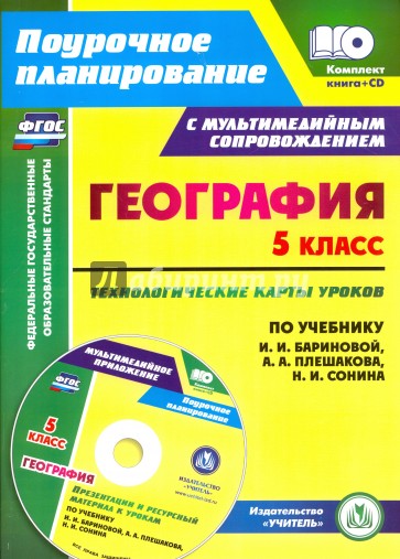 Предлагается комплект (книга + диск), состоящий из пособия с технологическими картами уроков географии в 5 классе и мультимедийного приложения с презентациями, ресурсными материалами, разработанный в соответствии с положениями ФГОС ООО, ориентированный на работу по учебнику И. И. Бариновой, А. А. Плешакова, Н. И. Сонина, входящему в классическую линию учебников по географии системы "Вертикаль" (М.: Дрофа, 2016).