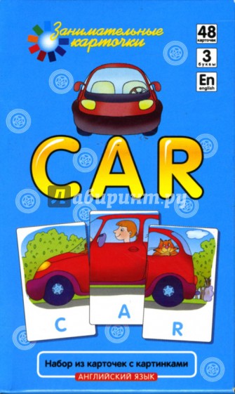 В набор входят 48 карточек, из которых можно составить 16 картинок. Если правильно подобрать картинку, получаются слова на английском языке, состоящие из трех букв.