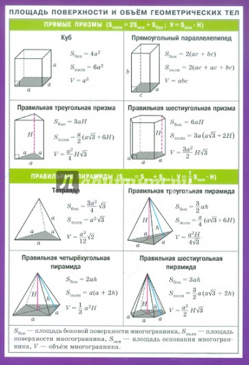 Справочный материал по математике предназначен для индивидуальной работы учащихся в классе и дома. Пособие содержит систематизированную учебную информацию представленную в краткой табличной форме по темам: площадь поверхности и объем многогранников, площадь поверхности и объем круглых тел. Пособие позволяет быстро находить необходимые сведения по теме, обобщить знания, способствует более прочному запоминанию учебного материала.
