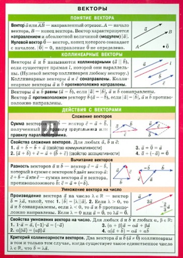 Наглядное пособие поможет закрепить и частично расширить сведения, полученные школьниками на уроках математики по теме "Векторы". Пособие отличают удобный формат и ёмкость изложения. Сжатые теоретические сведения и основные формулы помогут школьникам быстро сориентироваться в материале, проанализировать и выбрать верное решение задачи. Пособие будет полезно учащимся при подготовке к контрольным, самостоятельным работам и подготовке к ЕГЭ.