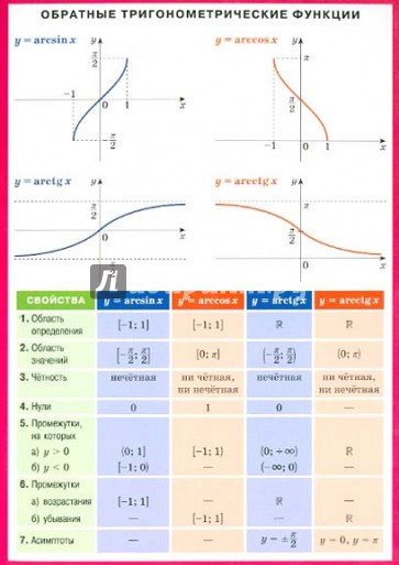 Справочный материал по математике предназначен для индивидуальной работы учащихся в классе и дома. Пособие позволяет быстро находить сведения по теме, обобщить знания, способствует более прочному запоминанию учебного материала. Справочные материалы содержат "Свойства обратных тригонометрических функций. Простейшие тригонометрические уравнения. Примеры обозначений обратных тригонометрических функций". Основная задача наглядного пособия - закрепить и частично расширить сведения, полученные школьниками на уроках математики. Сжатые теоретические сведения, представленные в таблицах, ключевые формулы, графики помогут школьникам быстро сориентироваться в материале, проанализировать и выбрать верное решение. Наглядное пособие имеет удобный формат и будет полезно учащимся при подготовке к контрольным, самостоятельным работам и ЕГЭ.