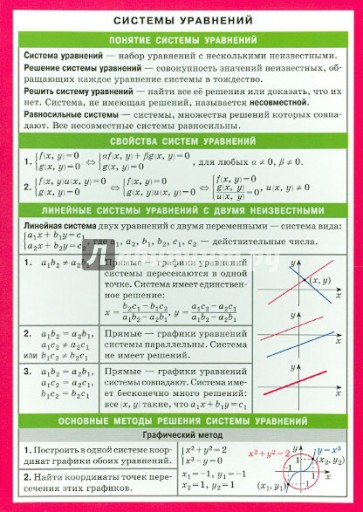 Наглядное пособие поможет закрепить и частично расширить сведения, полученные школьниками на уроках математике по теме "Системы уравнений". Пособие отличают удобный формат и ёмкость изложения. Сжатые теоретические сведения и основные формулы помогут школьникам быстро сориентироваться в материале, проанализировать и выбрать верное решение задачи. Пособие будет полезно учащимся при подготовке к контрольным, самостоятельным работам и подготовке к ЕГЭ.