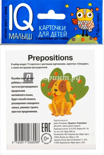 Набор "Предлоги" знакомит ребенка с наиболее часто встречающимися предлогами английского языка, способствует расширению словарного запаса. В набор входят 15 карточек с цветными картинками, карточка "Словарик" и инструкция для родителей. Предназначен для детей дошкольного возраста.