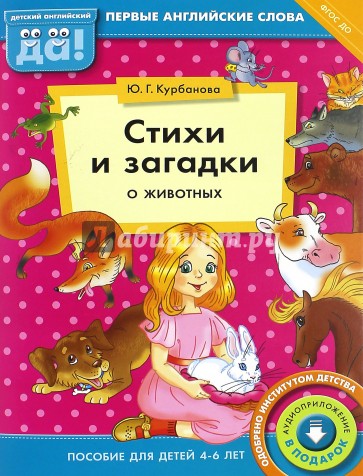 С помощью книг "Стихи и загадки о…" дети знакомятся с окружающим миром и учат самые важные и полезные слова английского языка. Каждая книга включает стихотворения на русском языке, объясняющие явление или предмет и заканчивающиеся английским словом, называющим его, и загадки в стихах, для ответа на которые ребенок должен вспомнить, как этот предмет называется по-английски. Книги красочно иллюстрированы, а материалы для раскрашивания и поделок надолго займут ребенка и помогут не только лучше запоминать английские слова, но и развивать творческие способности. Все тексты книг озвучены. Рекомендуются для детей в возрасте 4-6 лет. Данная книга знакомит детей с 10 животными и их названиями на английском языке.
