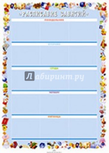 "Расписание занятий" - новое пособие из серии "Информационно-деловое оснащение ДОУ". Оно может использоваться при оформлении интерьера группового помещения или в качестве дидактического материала на занятиях по развитию временных представлений у дошкольников 5-7 лет. Лист с расписанием занятий помещается на стену на уровне роста детей. Лист с карточками-символами занятий разрезается по указанным линиям, карточки снабжаются "липучками" и помещаются в контейнер или коробку. На лист "Расписание занятий" в рамки для карточек тоже наклеиваются "липучки".