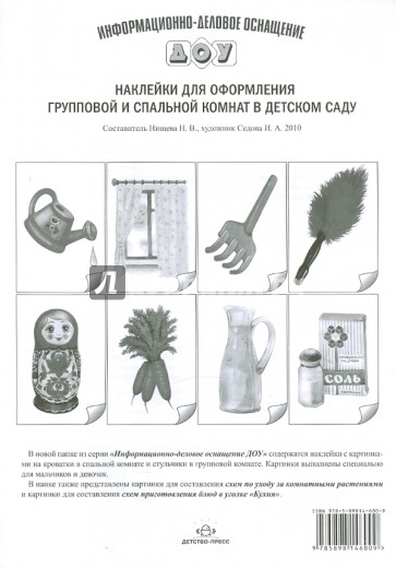 В новой папке из серии "Информационно-деловое оснащение ДОУ" содержатся наклейки с картинками на кроватки в спальной комнате и стульчики в групповой комнате. Картинки выполнены специально для мальчиков и девочек. Они яркие, забавные, хорошо запоминаются. В папке также представлены картинки для составления схем по уходу за комнатными растениями и картинки для составления схем приготовления блюд в уголке "Кухня".