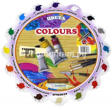 На центральном круге представлены 16 изображений и их названия на русском языке. Сопоставляя вырез на внешнем круге с изображением, можно прочитать его название на английском. То же самое - на второй стороне круга. Каждое пособие позволяет выучить и запомнить 32 слова.