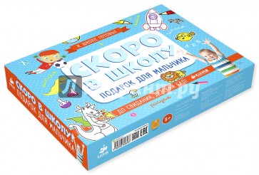 "Скоро в школу" - это две коробки, два набора - для мальчика и для девочки. В каждой коробке вы найдете набор необходимых развивалок и книг, которые пригодятся на каникулах тем, кто собирается 1 сентября сесть за парту.