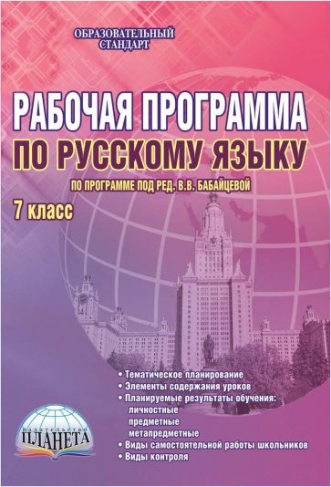 В книге представлена рабочая программа по русскому языку для 7 класса, созданная на основе авторской программы под редакцией В.В. Бабайцевой с учетом линий УМК, вошедших в Федеральный перечень учебников на 2014-2015 учебный год. Рабочая программа составлена с учетом требований Федерального государственного образовательного стандарта второго поколения и Примерной программы основного общего образования по русскому языку. Книга содержит пояснительную записку, подробное календарно-тематическое планированием с указанием темы и типа урока, элементов содержания образования на уроке, планируемых результатов обучения (личностных, предметных, метапредметных), видов самостоятельной работы, направленных на формирование у обучающихся УУД, а также видов контроля достижения метапредметных и предметных результатов обучения.
