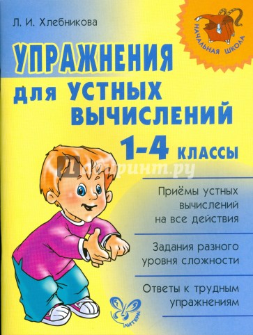 В книге подробно изложены приемы устных вычислений, причём последовательность их изложения соответствует плану изучения в начальной школе. Здесь также представлено большое количество упражнений на отработку практических навыков. К отдельным, наиболее сложным заданиям, приведены ответы в конце книги.