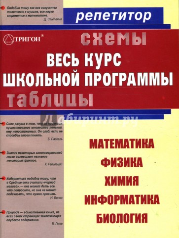 Справочное пособие предназначено учащимся общеобразовательных школ. В наглядных таблицах и схемах изложен весь материал школьной программы по математике, физике, химии, информатике и биологии. Книгу можно использовать для подготовки к урокам, контрольным и самостоятельным работам. Предложенная форма подачи материала удобна для старшеклассников и абитуриентов при подготовке к экзаменам, так как позволяет систематизировать знания, облегчает понимание сложных определений, понятий и формул.