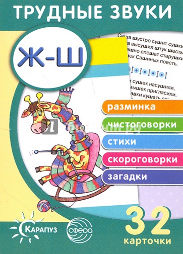 Данный материал, рассчитанный на курс из 24 занятий, поможет ребёнку закрепить неустойчивые звуки Ж-Ш. Проводить их следует ежедневно по 10-15 минут, делая перерывы на выходные (в течение 3-4 недель). Методика проведения описана на последней карточке.