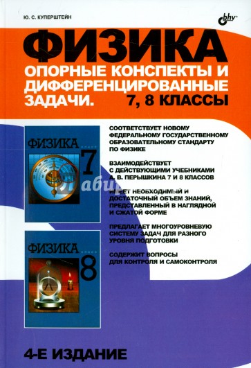 Книга является дополнительным пособием для изучения физики по учебникам А. В. Перышкина 7 и 8 классов и отвечает требованиям Государственного стандарта образования по физике. Курс физики для основной школы представлен в виде опорных конспектов, указаны ссылки на учебники. По каждой теме имеются контрольные вопросы и дифференцированные задачи, позволяющие усваивать содержание предмета учащимся с разным уровнем подготовки по физике. Может применяться для организации учебной деятельности учащихся в классе при очном обучении, экстернате, домашней и самостоятельной работы.