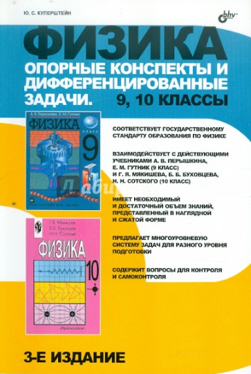 Книга является дополнительным пособием для изучения физики по учебникам А. В. Перышкина, Е. М. Гутник (9 класс) и Г. Я. Мякишева, Б. Б. Буховцева, Н. Н. Сотского (10 класс) и отвечает требованиям Государственного стандарта образования по физике. Школьный курс физики представлен в виде опорных конспектов, указаны ссылки на учебники. По каждой теме имеются контрольные вопросы и дифференцированные задачи, позволяющие усваивать содержание предмета учащимися с разным уровнем подготовки по физике. Может применяться для организации учебной деятельности учащихся в классе при очном обучении, экстернате, в домашней и самостоятельной работе.