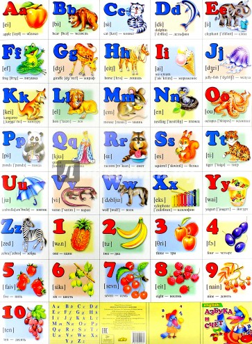 Наглядное пособие в виде иллюстрированного плаката с английским алфавитом и цифрами для дошкольников и младшего школьного возраста.
