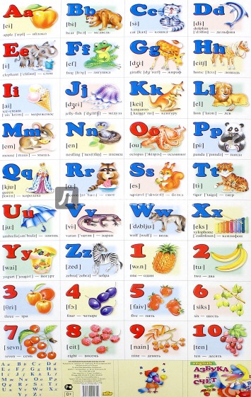 Наглядное пособие в виде иллюстрированного плаката с английским алфавитом и цифрами для дошкольников и младшего школьного возраста.