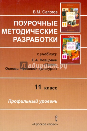 Методическое пособие кандидата юридических наук В. М. Сапогова разработано к учебнику Е.А. Певцовой "Право. Основы правовой культуры. 11 класс" и предназначено для изучения права на профильном уровне. Книга содержит тематическое планирование и разработки уроков. Выдержки из нормативных правовых актов, тесты, кроссворды, таблицы, схемы, кластеры, логические цепочки, рекомендации по подготовке к итоговому тестированию, темы для докладов и рефератов и др. здесь представлены традиционные и инновационные методики, применяемые преподавателями права.