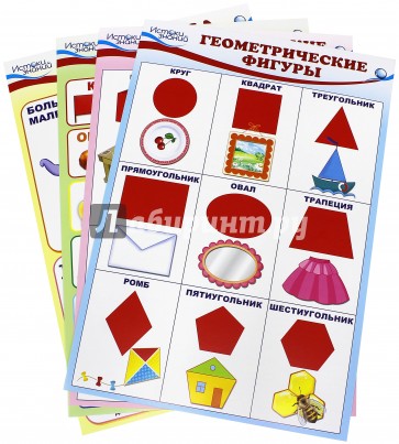 В комплект входит 4 плаката: "Геометрические фигуры", "Геометрические формы", "Цвета", "Величина".