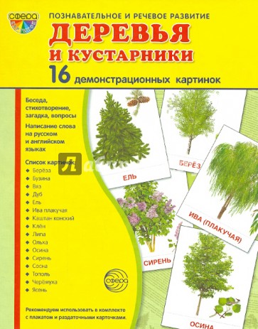 16 демонстрационных картинок: береза, бузина, вяз, дуб, ель, ива плакучая, каштан конский, клен, липа, ольха, осина, сирень, сосна, тополь, черемуха, ясень.