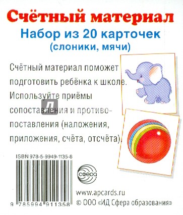 Набор состоит из 20 карточек с изображением слоников и мячей.
