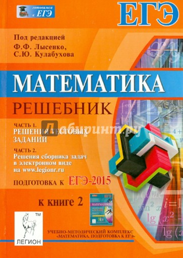 Данный решебник поможет выпускнику быстро освоить весь необходимый материал и успешно подготовиться к ЕГЭ по математике. Он состоит из двух частей. Часть I - настоящее пособие. Оно содержит решения всех вариантов учебно-тренировочных тестов пособия "Математика. Подготовка к ЕГЭ-2015. Книга 2" под редакцией Ф.Ф. Лысенко, С.Ю. Кулабухова. Часть II - решения сборника задач, которые размещены в электронном виде на сайте издательства legionr в свободном доступе (бесплатно). Пособие входит в учебно-методический комплекс "Математика. Подготовка к ЕГЭ", включающий такие книги, как "Математика. ЕГЭ-2015. Учебно-тренировочные тесты", "Математика. 10-11 классы. Тренажер для подготовки к ЕГЭ: алгебра, планиметрия, стереометрия" и др.
