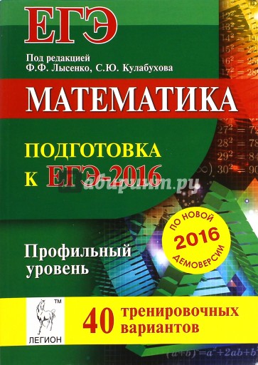 Учебно-методическое пособие предназначено для фундаментальной подготовки к профильному уровню ЕГЭ по математике в 2016 году. Книга содержит: 40 новых авторских тренировочных тестов, составленных по проектам демоверсии и спецификации ФИПИ на 2016 год профильного уровня ЕГЭ по математике; решение 10 вариантов тестов; краткий теоретический справочник. Книга позволит выпускникам и абитуриентам получить на ЕГЭ желаемый результат - от минимального количества баллов, необходимого для сдачи экзамена, до максимально возможного, практически до 100 баллов. Издание адресовано выпускникам общеобразовательных учреждений, учителям, методистам.