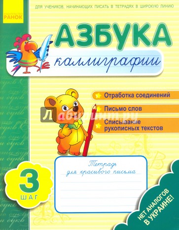 Тетради "Азбука каллиграфия" созданы для организации работы над каллиграфией во время обучения детей письму в широкую линию. Тетрадь "Азбука каллиграфии. Шаг 3 "содержит упражнения на отработку различных видов соединений, их применение при записи слов и учит списанию рукописных текстов. Благодаря задачей тетради можно исправить недостатки почерка, научиться правильно соединять и каллиграфически писать буквы украинского алфавита, грамотно списывать тексты. Кроме этого подобранные упражнения развивают внимание и навыки самоконтроля. Материалы пособия можно использовать на уроках и во внеурочное время. Для учителей начальной школы, учащихся и их родителей.